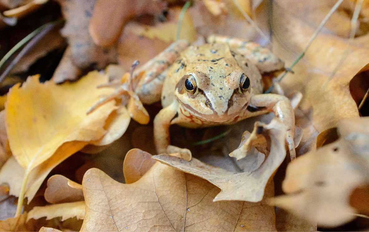 Many frogs survive the cold winter months by burying themselves under mud and decaying leaves. They then wait out the freezing temperatures by lying there inactive to save up their energy. This practice is similar to mammals that hibernate through the winter.