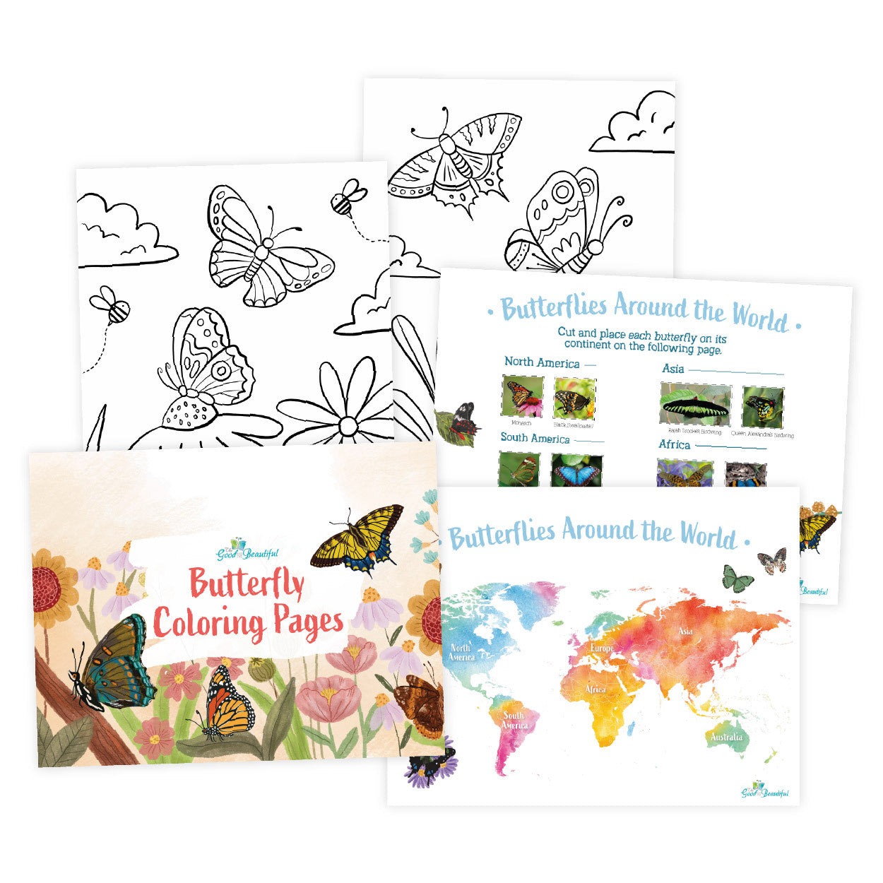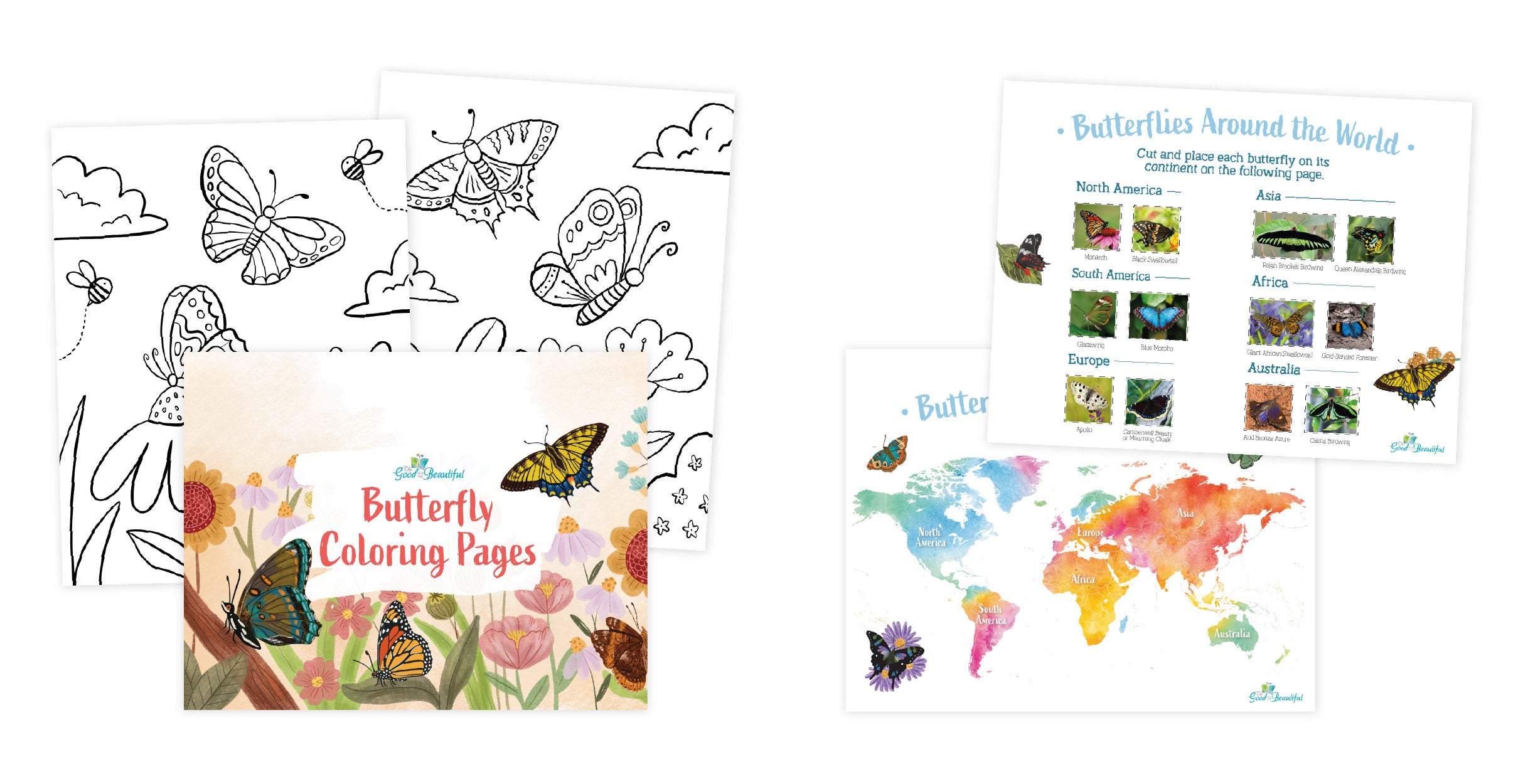 • Download this free set of butterfly coloring pages and world map activity, where children can place each butterfly on its correct continent.