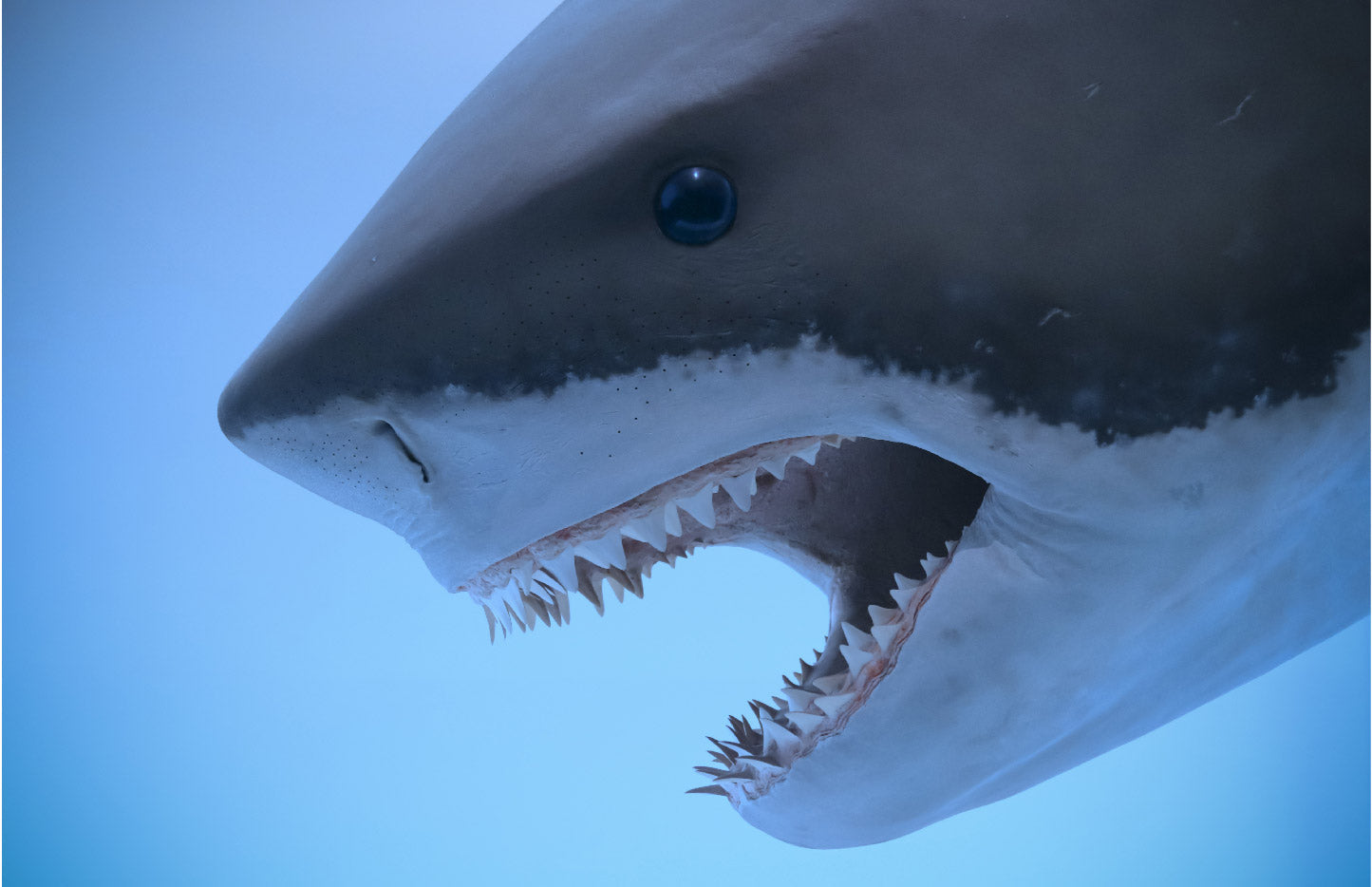 A: Sharks have a transparent membrane that closes over their eyeballs for protection while attacking. A small handful of shark species, such as the great white, do not have this membrane. Instead, they roll their eyes for protection.