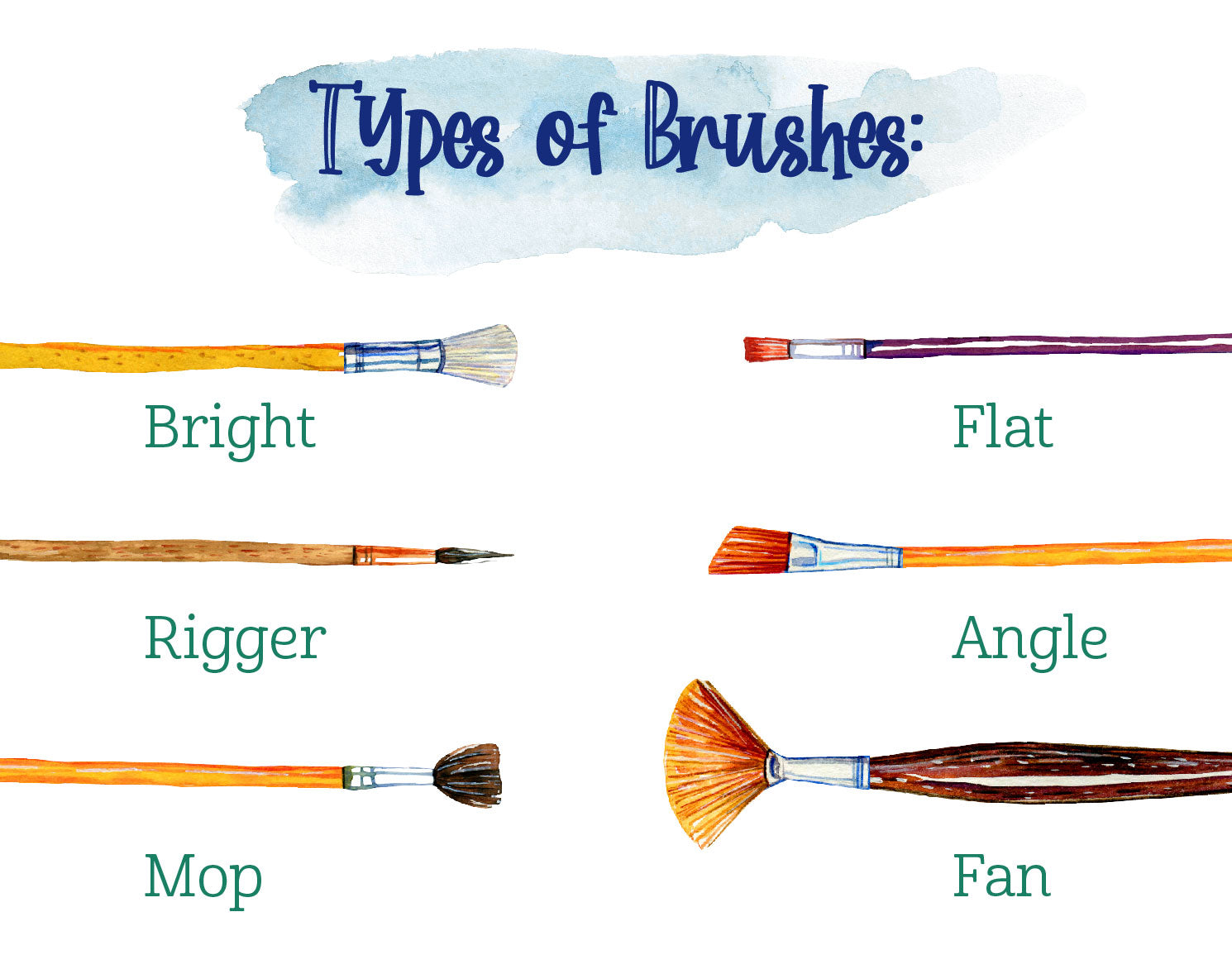 - Mop: wide but comes to a fine point; good for thin and wide strokes and for blending