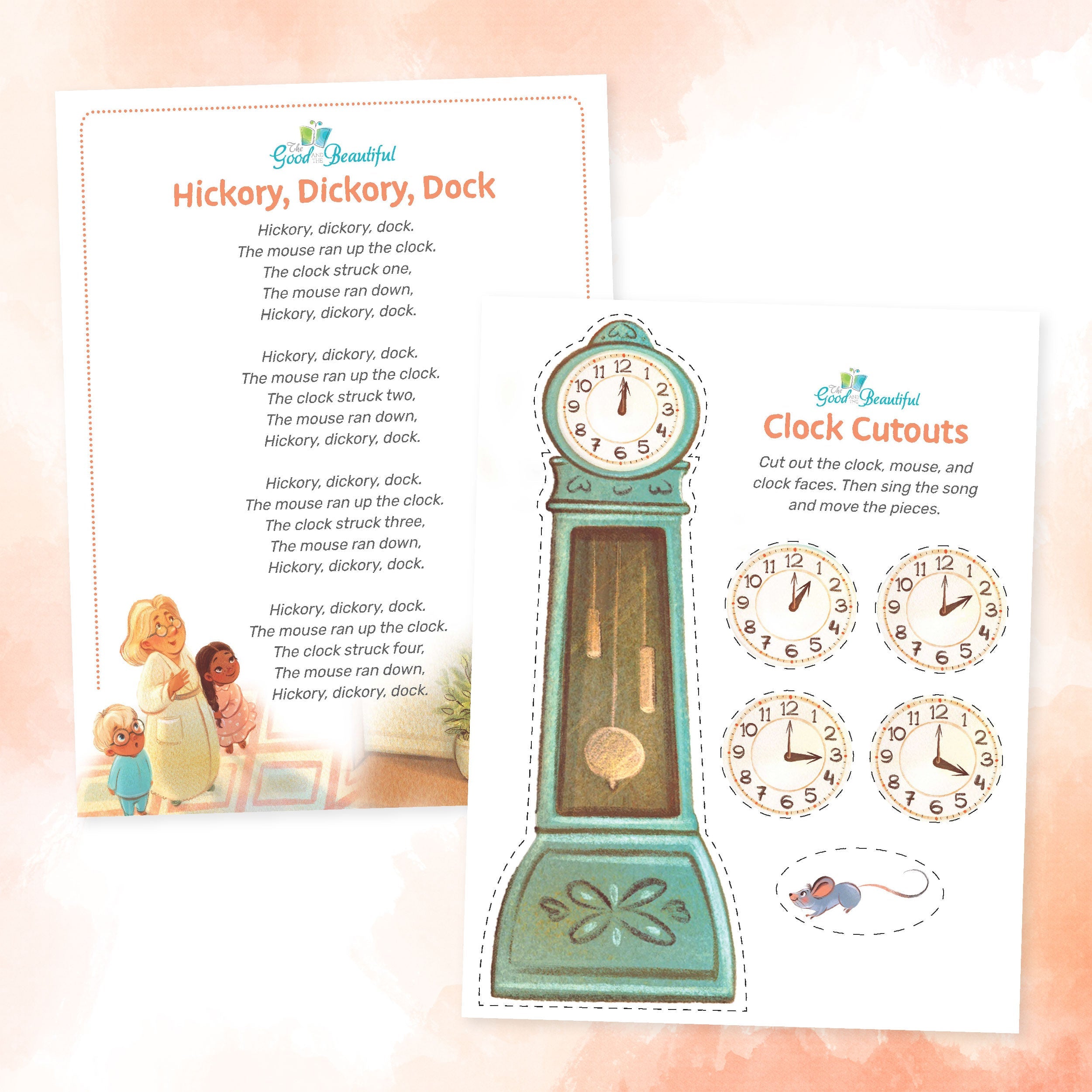 In the beloved telling-time nursery rhyme “Hickory, Dickory, Dock,” a little mouse runs up and down the clock every hour, making this rhyme a perfect tool for helping children learn to tell time. Join the fun by singing along with the charming video, and then download our free printable lyrics and clock to practice telling time with your kids.