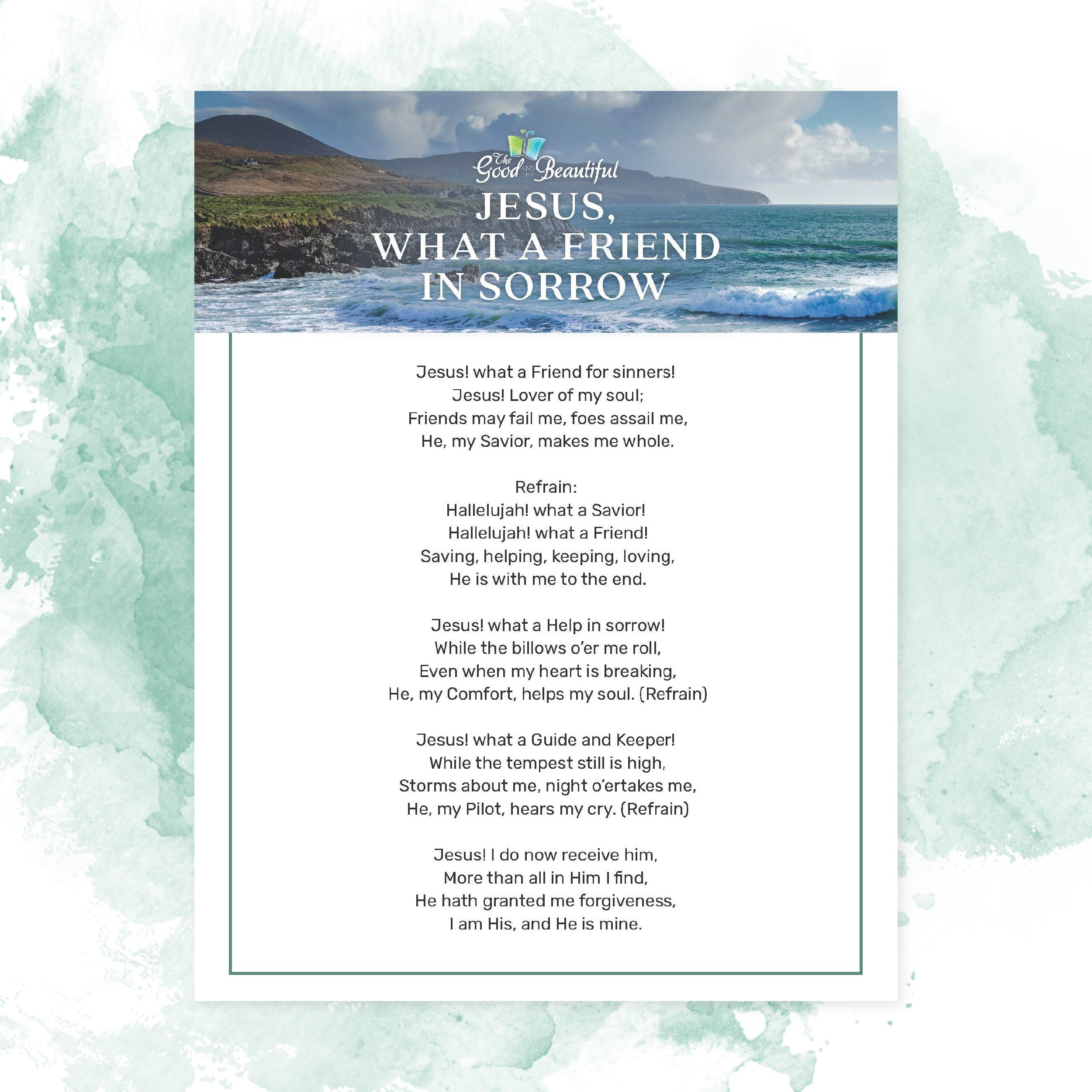 Find peace and encouragement in this beautiful rendition of “Jesus, What a Friend in Sorrow,” performed by Kate Phillips and Josh Thorne. This gentle arrangement, featuring piano and strings, reflects the deep love and grace of our Savior and is part of our upcoming music appreciation course. Keep reading to print the lyrics and learn more about the hymn.