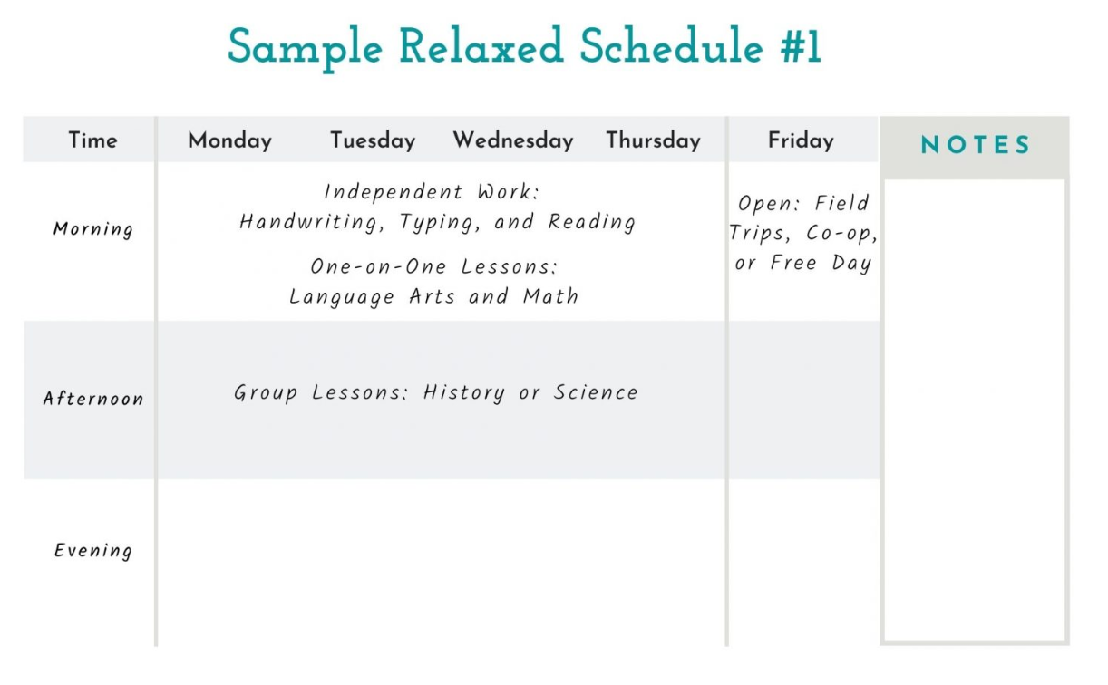 - A relaxed schedule is a semi-structured homeschool plan, but it is also very flexible for your family’s needs. This family keeps Fridays open for field trips, appointments, and other things that come up.
