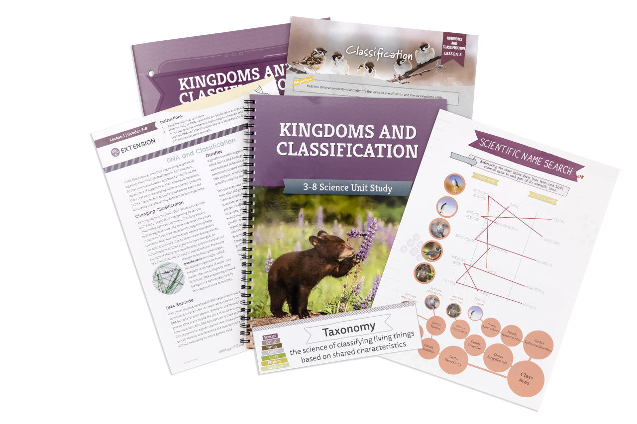 Each student grades 3–6 needs their own copy of the 32-page Kingdoms and Classification Student Journal which includes interactive activities, games, and worksheets the child will complete during the lessons. The parent-led lessons in the Course Book will direct the student regarding when to complete the Student Journal activities.