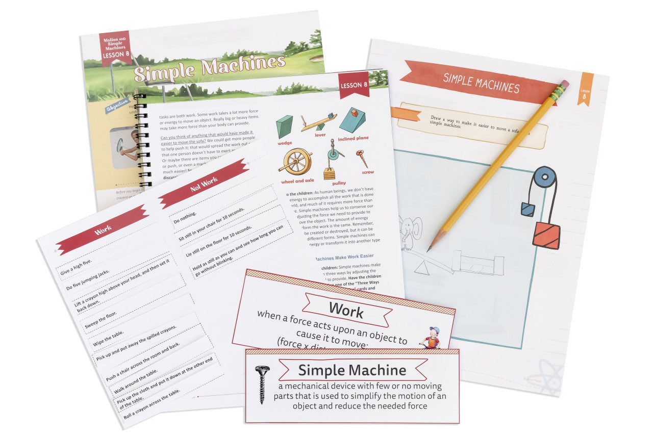 Each student grades 3–6 needs their own copy of the 24-page Motion and Simple Machines Student Journal which includes interactive activities, games, and worksheets the child will complete during the lessons. The parent-led lessons in the Course Book will direct the student regarding when to complete the Student Journal activities.