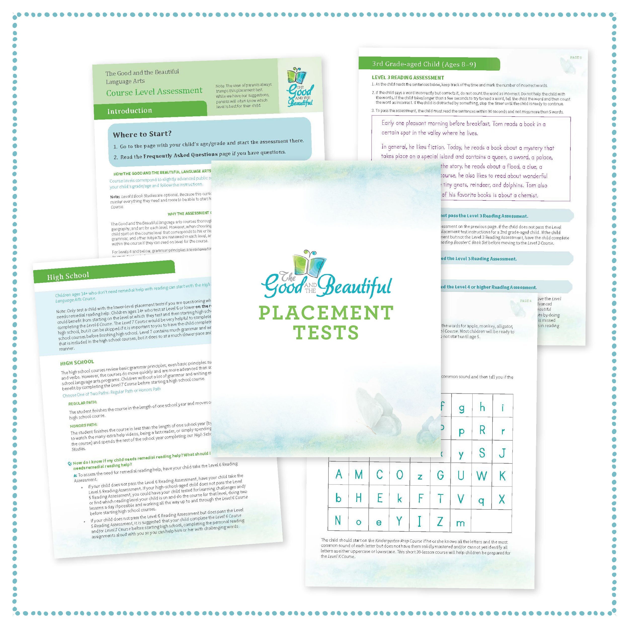 Take TestsComplete the Placement Tests for language arts, math, and reading found at goodandbeautiful.com/placement to help you place your child at the correct language arts or math level. Detailed instructions for administering the tests are found in the downloads.