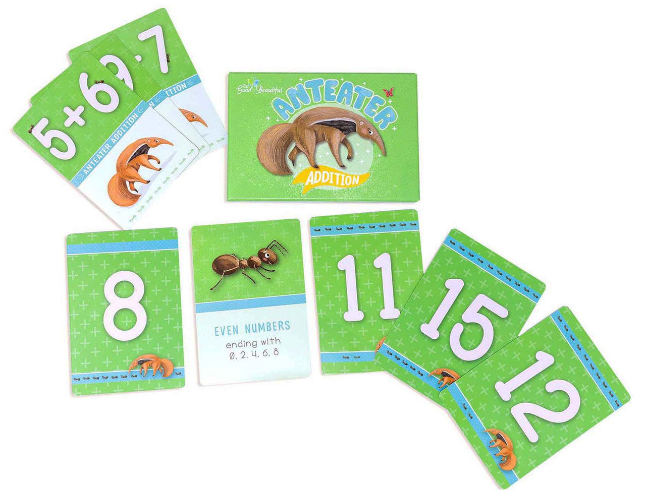 This one-of-a-kind original game offers great math fact practice for children in grades K and higher. Two games offered in both single-player or two-player options help children practice facts independently or with a parent or partner. Addition facts 1–9 are practiced along with odd and even. This game is recommended to complement the Simply Good and Beautiful Math K Course along with Snowy Owl Subtraction. These games can also be used for children in Math 1 and above for additional practice and mastery. Full-color sturdy 5″X3.5″ box includes: