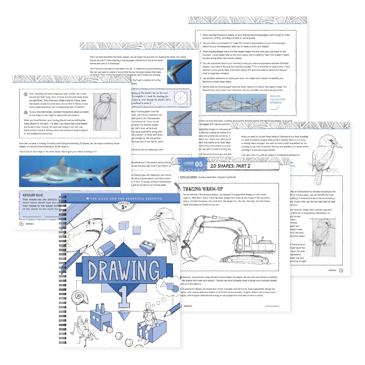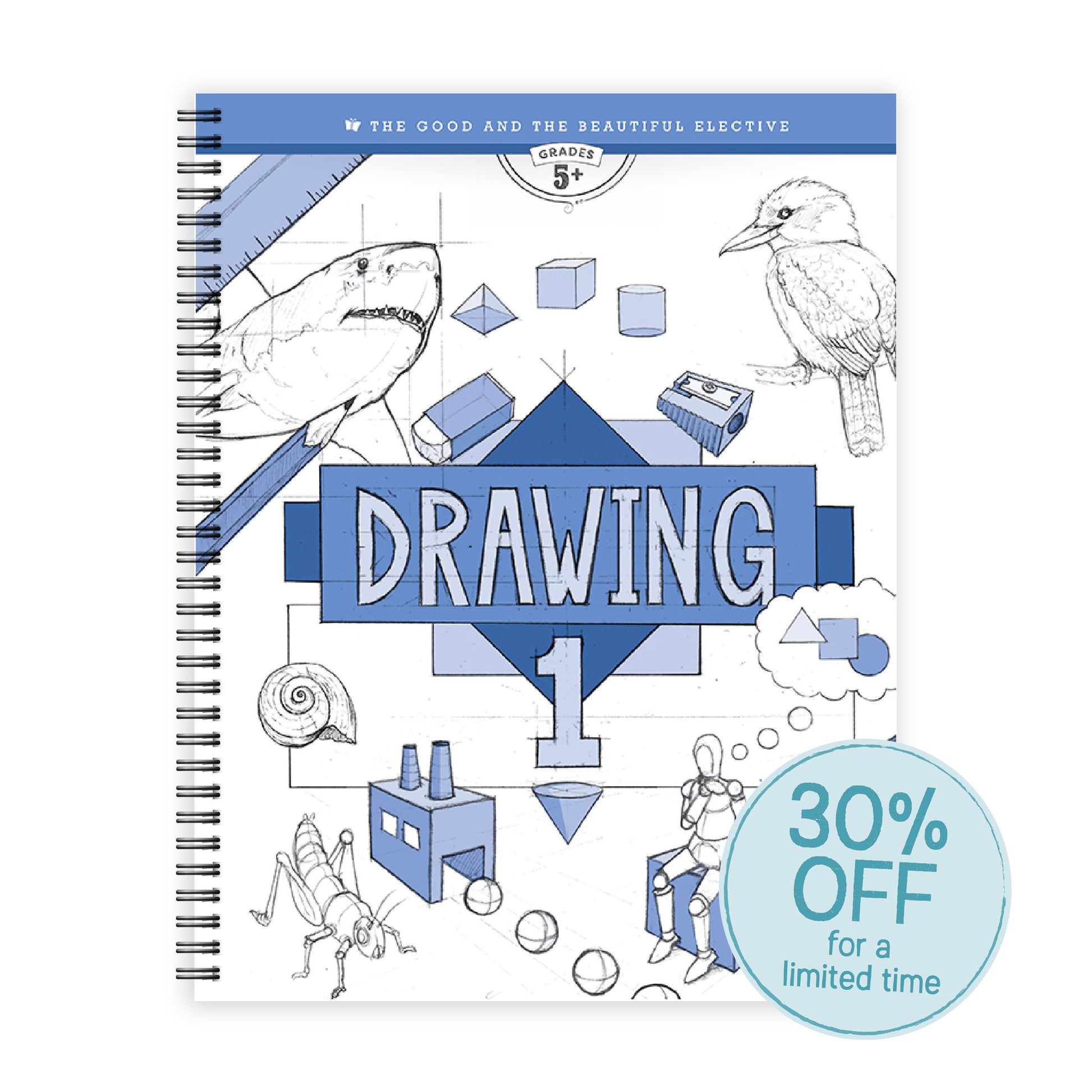 Come along with a real-life illustrator from The Good and the Beautiful to learn how to draw anything you can see or imagine in Drawing 1! The 14 lively, self-led lessons give students in grades 5 and up a solid foundation in sketching and drawing. Starting from beginning basics such as choosing tools, how to hold one’s hand and paper, tracing methods, and basic 2D drawing, students then progress through various techniques including shape drawing; 3D drawing; using perspective, focal points and lines; composition; creative sketching, and more!