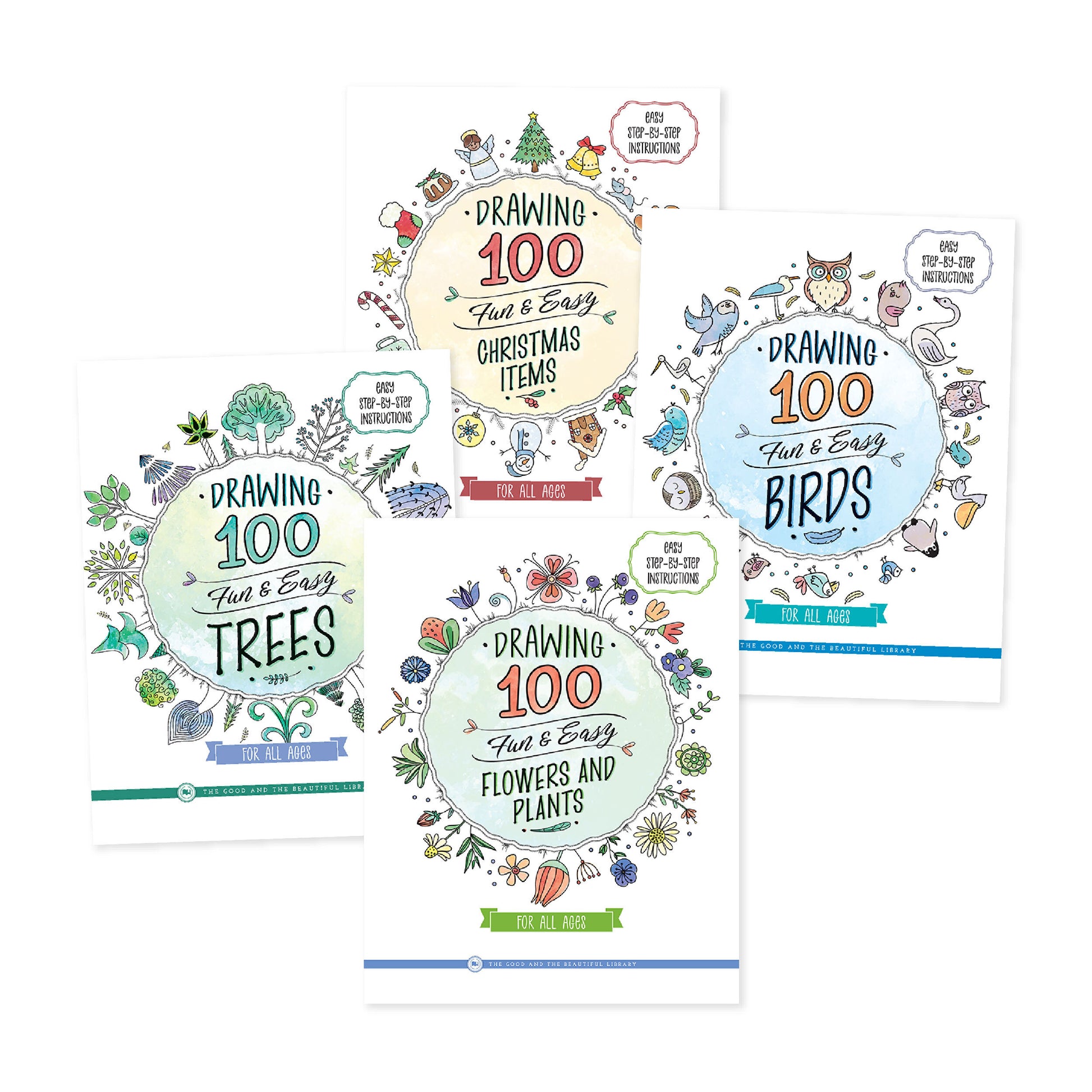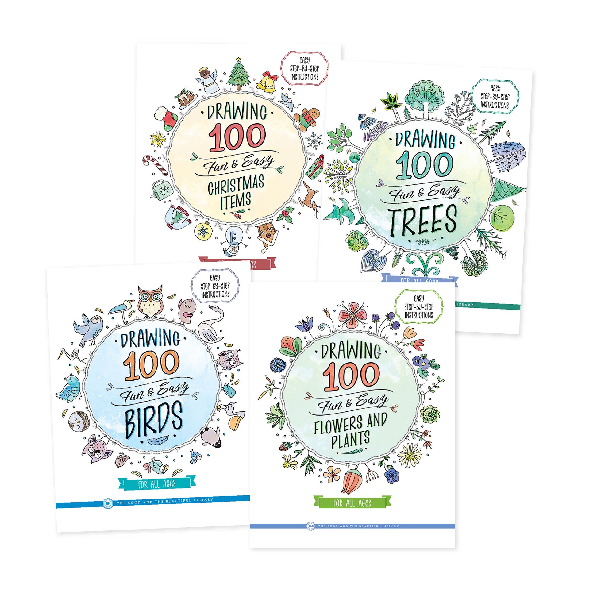 4 Drawing 100 Fun & Easy Books: Trees, Birds, Flowers and Plants, Christmas Items