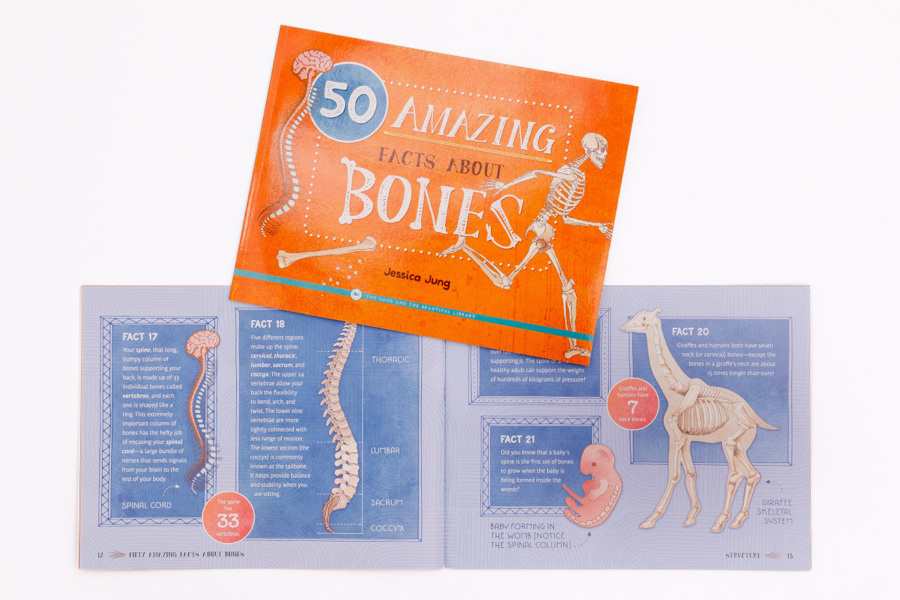 50 Amazing Facts About Bones is a comprehensive book about bone anatomy and physiology. Full of illustrations, diagrams, sketches, and X-ray images, this book is thorough enough to engage a curious first-time bone explorer and enrich a student's current skeletal study. (29 pages, full-color, 11"x8.5")