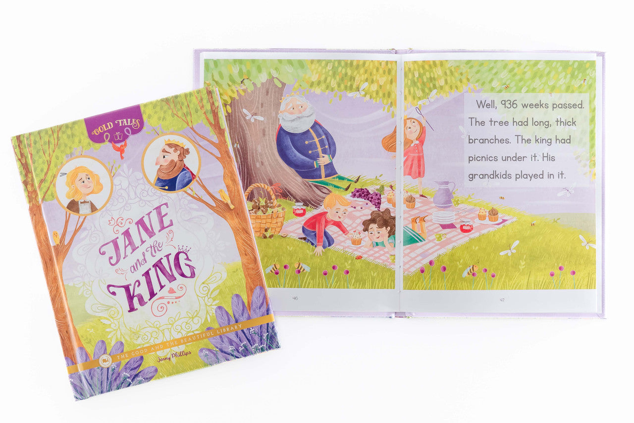 Jane and the King is part of the Gold Tales series. These hardcover Level 1 books with whimsical illustrations and uplifting messages are all original publications and can be read in any order. The Gold Tales series also includes Blake the Brave, Jack and the Lost Maze, and A Crown for Kate.