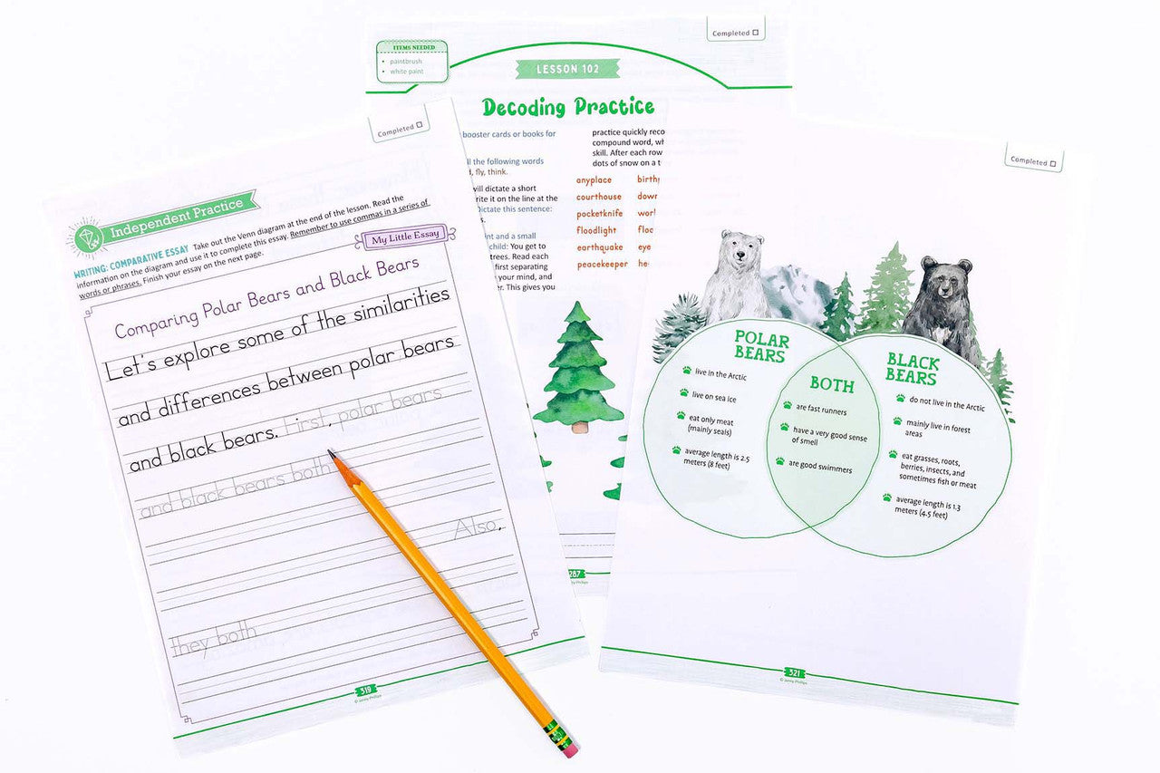 The 120 engaging parent-led lessons in the Level 2 Course Book are open-and-go and were carefully designed to reduce teaching time, yet be academically robust. The course covers over 80 foundational principles, such as phonics, spelling rules, spelling patterns, homophones, reading comprehension, alphabetical order, art appreciation, and so much more. All of this is taught in gentle, natural, and enjoyable ways for the child.
