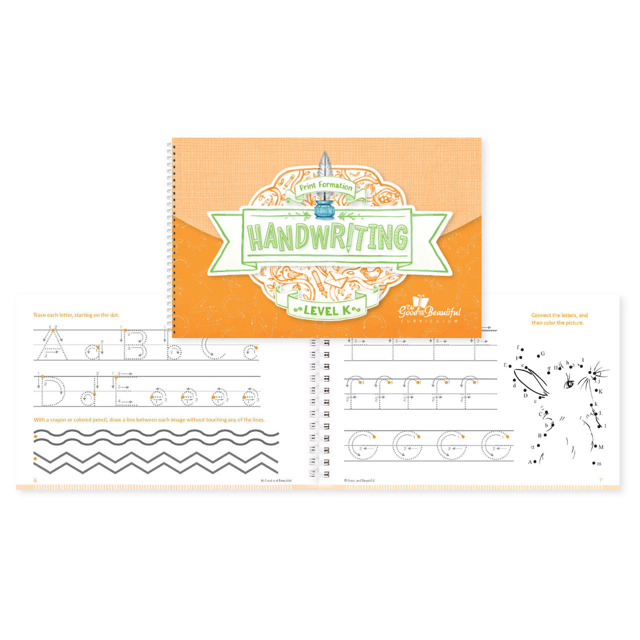 Handwriting Level K is for children in kindergarten and focuses on the correct print formation of letters and numbers. This course introduces 2–3 new letters at a time, going in alphabetical order, and introduces short words and sentences near the end. Text size is reduced halfway through the course as the child gains the fine motor skills for smaller print. The Good and the Beautiful handwriting courses incorporate drawing activities to make handwriting more enjoyable and increase fine motor skills. This workbook includes 100 sheets, which is 3–4 sheets per week for an average school year.